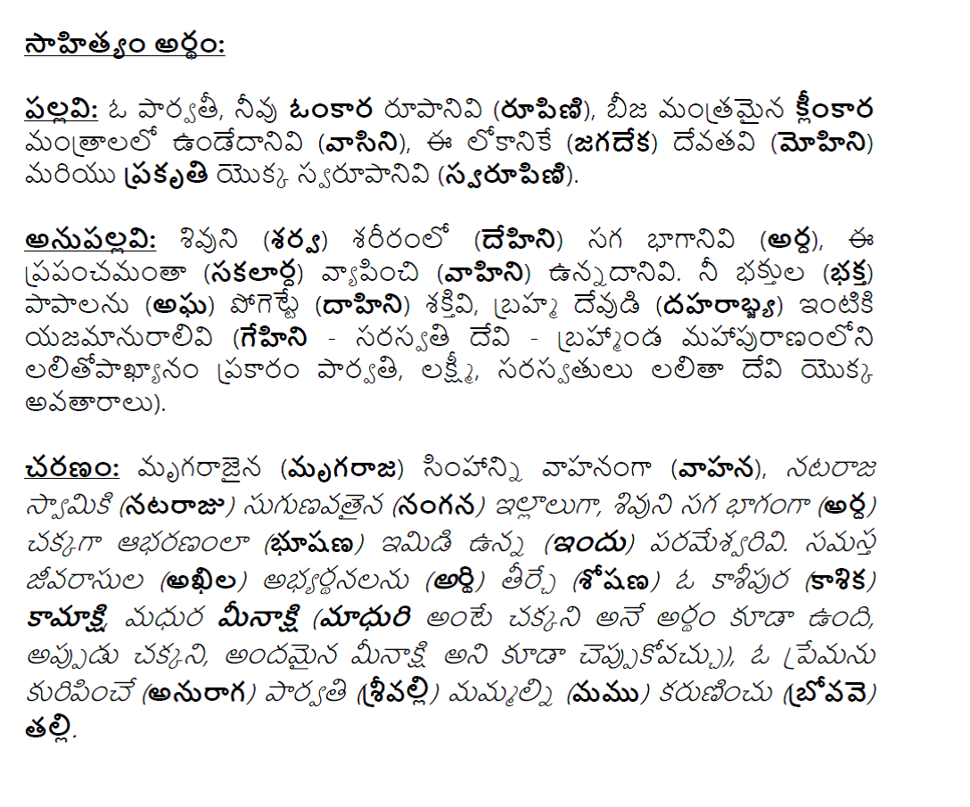 అనుపల్లవి: శివుని శరీరంలో సగ భాగానివి, ఈ ప్రపంచమంతా వ్యాపించి ఉన్నదానివి. నీ భక్తుల పాపాలను పోగెట్టే శక్తివి, బ్రహ్మ దేవుడి ఇంటికి యజమానురాలివి (సరస్వతి దేవి-బ్రహ్మాండ మహాపురాణంలోని లలితోపాఖ్యానం ప్రకారం పార్వతి, లక్ష్మీ, సరస్వతులు లలితా దేవి యొక్క అవతారాలు).
